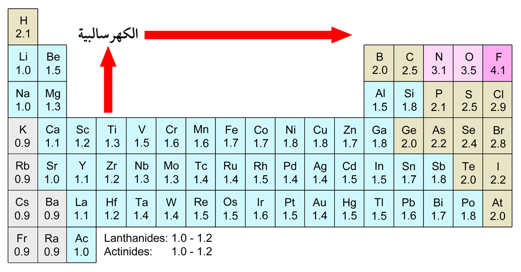 الكهروسالبية والقطبية الميل الالكتروني والكهروسالبية وخواص الروابط الرابطة التساهمية القطبية خواص المركبات التساهمية properties of covalent compounds المواد الصلبة التساهمية الشبكية covalent network solids خواص الجزيئات. وتم اقتراحها في عام 1934 عن طريق روبرت إس مولكين. هي زوج من الإلكترونات يربط بين ذرتين نتيجة لمساهمة كل ذرة بإلكتر. تعرف الكهرسلبية بانها قدرة الذرة على جذب الإلكترونات التي تربطها بذرة أخرى في الجزيء و هي نصف حاصل جمع قيم الألفة الإلكترونية و طاقات التأين.