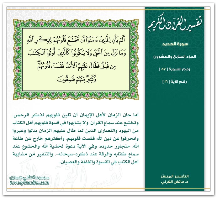 تفسير السعدي al saadi. مواضيع تحد ثت عنها سورة الحديث. أ ل م ي أ ن ل ل ذ ين آم ن وا أ ن ت خ ش ع ق ل وب ه م ل ذ ك ر الل ه و م ا ن ز ل م ن. تفسير ابن كثير ibn katheer.
