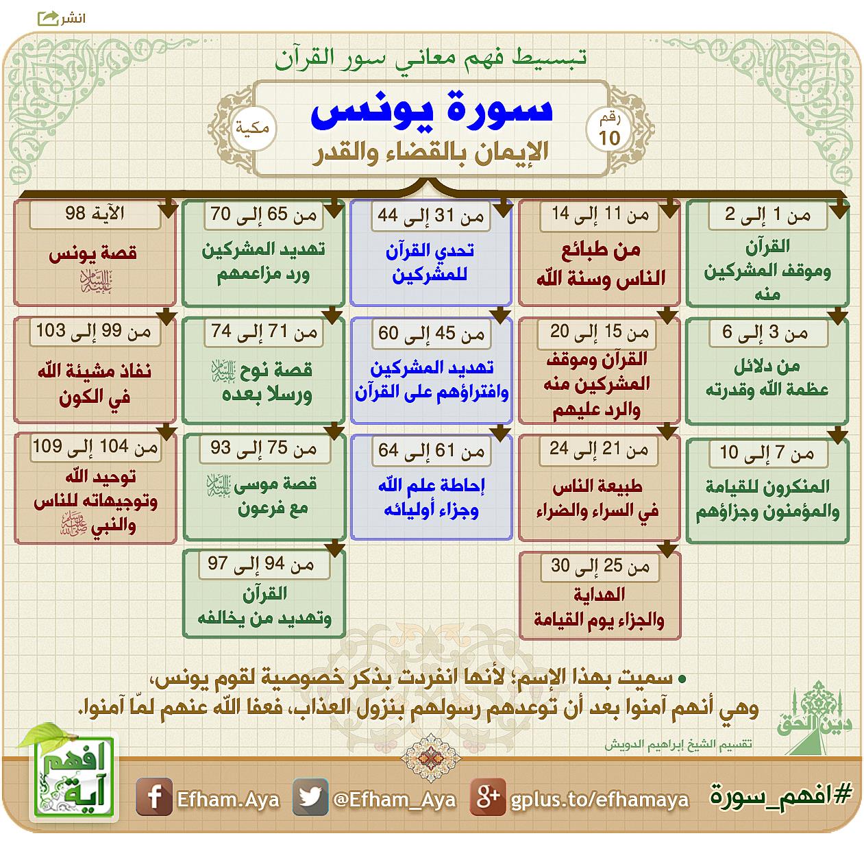 بحث عن سورة يونس. سورة يونس من السور المكية التي تعنى بأصول العقيدة الإسلامية الإيمان بالله تعالى وبالكتب والرسل والبعث والجزاء وبخاصة الإيمان بالقضاء والقدر فالكثير من الناس مشككين في هذا الأمر ويحتارون ويجادلون في القضاء والقدر. بحث عن يونس عليه السلام. سورة يونس الآية 98 و قال سبحانه وتعالى في سورة الأنبياء و ذ ا الن ون إ ذ ذ ه ب م غ اض ب ا ف ظ ن أ ن ل ن ن ق د ر ع ل ي ه ف ن اد ى ف ي الظ ل م ات أ ن. تفسير السمرقندي 2 102 الهداية لمكي القيسي 5 3205 جمال القراء للسخاوي 1 121 ومم ا يد ل على ك ون ها مكي ة ما اشتم ل ت عليه من موضوعات ت مي ز ت.