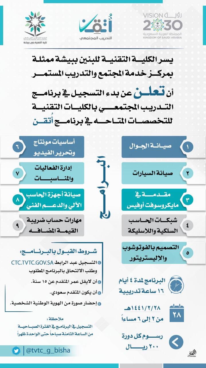 برنامج اتقن الكلية التقنية. التدريب التقني والمهني اعلن عن فتح باب التسجيل في برنامج أ تقن حيث تتجه عمليات البحث بداخل الأراضي الحجازية السعودية من قبل المواطنين السعوديين إلي. Tvtc مركز الأعمال. كما أكدت المؤسسة من خلال بيان لها أن الدورات التدريبية التي يتم تقديمها من خلال برنامج اتقن تشتمل على ما يلي. التسجيل في دورات برنامج أتقن الكلية التقنية.