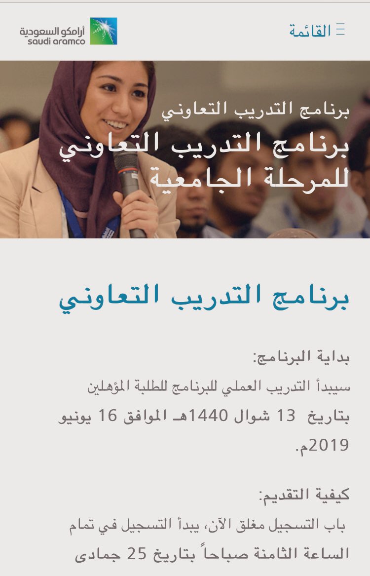 برنامج التدريب لطلبة الكليات المهنية. برنامج التدريب التعاوني للمرحلة الجامعية شركة أرامكو السعودية. تعلن شركة أرامكو السعودية بدء التقديم في برنامج التدريب التعاوني للمرحلة الجامعية لعام 2020م والذي يهدف إلى تزويد الطلاب بفرصة لإثراء خبراتهم الجامعية من خلال الربط بين الدراسات الأكاديمية والأوضاع العملية. النقل حسب أنظمة الشركة.