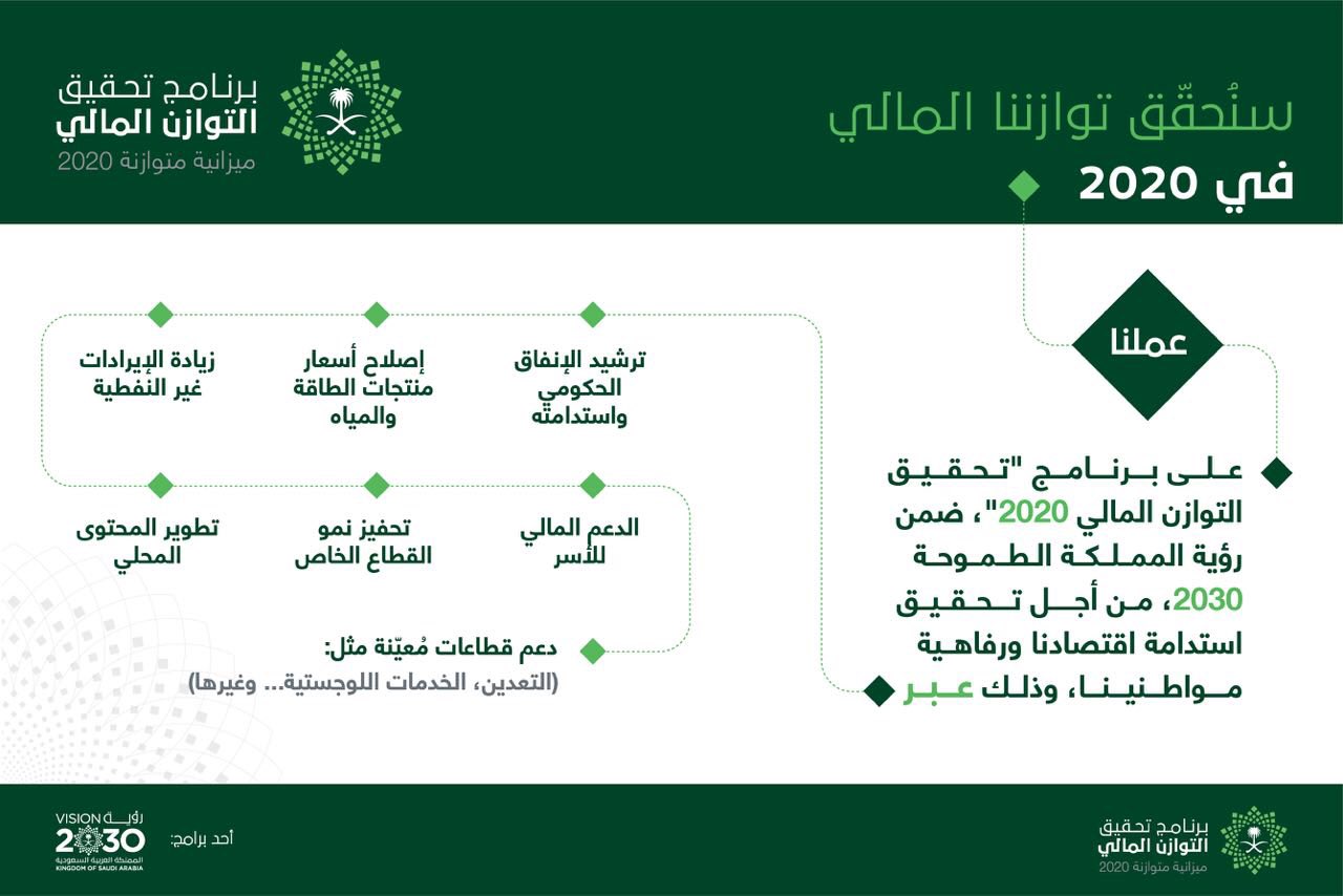 برنامج تحقيق التوازن المالي. وضع عام 2016 من قبل مجلس الشؤون الاقتصادية والتنمية السعودي كجزء مـن الإصلاحات المالية بهدف تحقيق ميزانية متوازنة بحلول عام 2023م وتعزيز الإدارة المالية وإعادة هيكلة الوضع المالي للمملكة واستحداث آليات. برنامج التوازن المالي سيقدم إدارة حكيمة للدين العام وذلك بما يحقق رؤية تحقيق زيادة في الإيرادات الحكومية غير النفطية من 163 مليار ريال سعودي لتصل لحوالي تريليون ريال خلال العام وهو ما ستوافق وأهداف رؤية المملكة العربية السعودية 2030 وبالتالي تم الإعلان عن برنامج تحقيق. برنامج تحقيق التوازن المالي 2018.