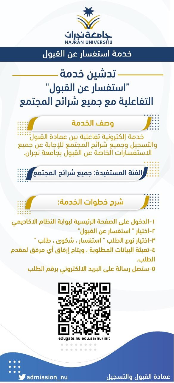 القبول والتسجيل الخدمات التي تقدمها عمادة القبول والتسجيل بوابة النظام الاكاديمي. Address najran univserity المملكة العربية السعودية نجران طريق الملك عبدالعزيز ص ب 1988 فاكس. عدد زوار الموقع. عدد المتصفحين الموجودين حاليا على البوابة هو.