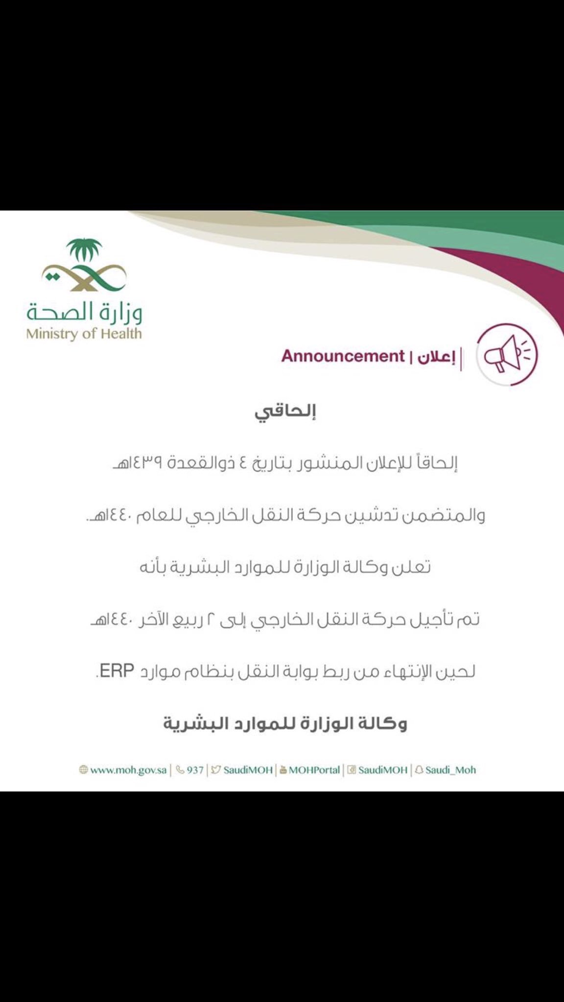 إعلان تعديلات هامة على النقل الخارجي 1439 حركة النقل لمنسوبي وزارة الصحة