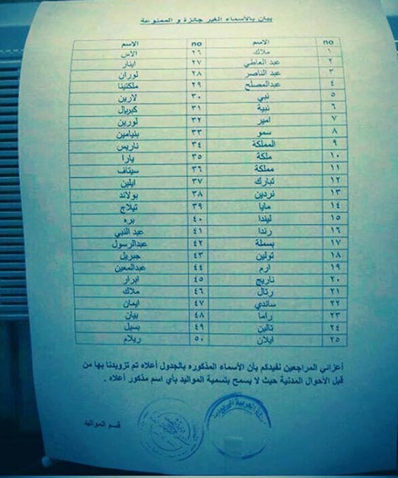 بيان بالاسماء الغير جائزة والممنوعة