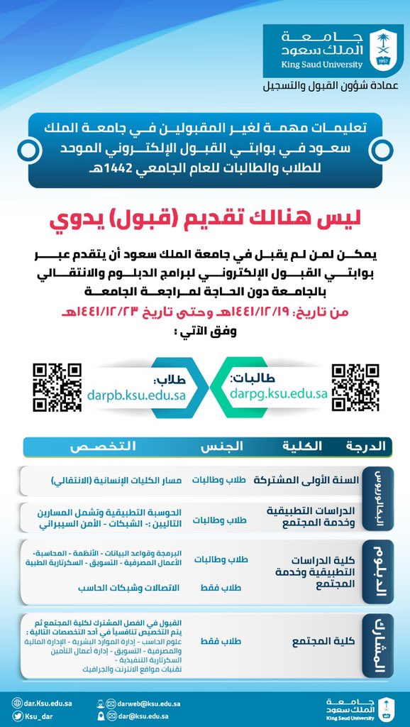 تجسير جامعة الملك سعود. جامعة الملك سعود بن عبدالعزيز للعلوم الصحية. جامعة الأميرة نورة بنت عبد الرحمن. ابتداء من تاريخ 05 يوليو 2020 م الموافق 14 ذو القعدة 1441 هـ. تجسير جامعة الملك سعود جامعة الملك سعود هي جامعة حكومية في مدينة الرياض وهي ثاني الجامعات الحكومية السعودية بعد جامعة أم القرى وتعتبر جامعة الملك سعود من جهة المساحة ثاني أكبر جامعات العالم وقد س ميت بجامعة الرياض ثم أ عيد تسميتها بعد ذلك بنفس الاسم وهو جامعة الملك.