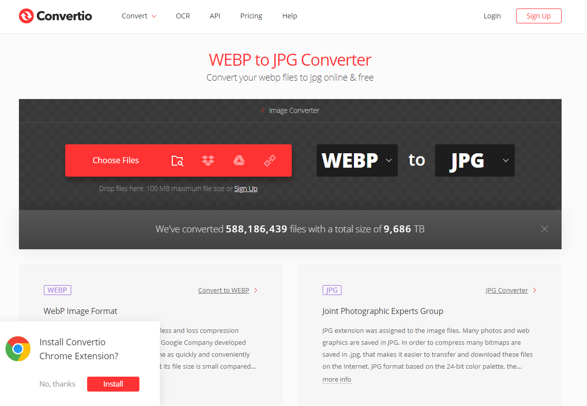 100 mb الحد الأقصى لحجم الملف أو تسجيل. نعم يمكنك استخدام anyconv على أي نظام تشغيل يحتوي على متصفح ويب. يعمل محول webp إلى jpg عبر الإنترنت ولا يتطلب تثبيت البرنامج. Convertio أداة متقدمة على الإنترنت تحل أي مشاكل تحدث مع الملفات.
